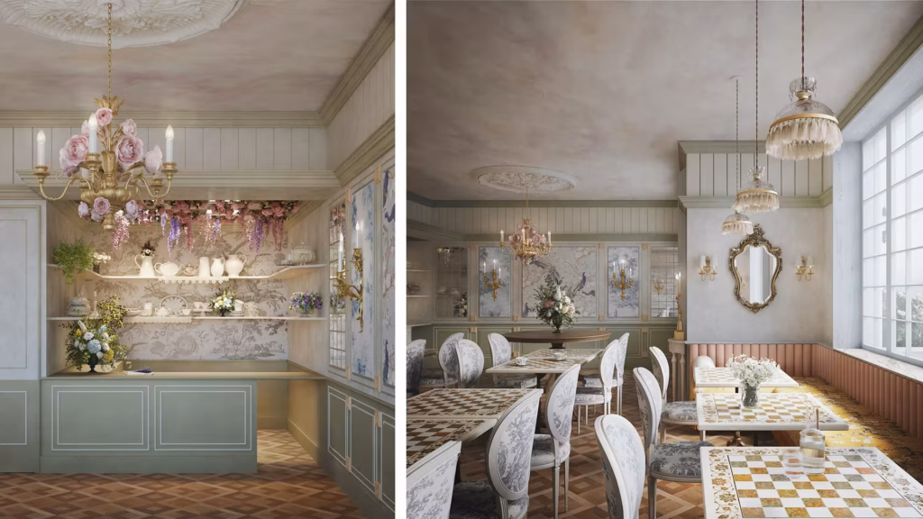 The space seamlessly integrates the functions of a flower shop and restaurant, including a bar area and banquet seating, blending simplified architectural lines with elegant, ornate furnishings to create a serene and inviting atmosphere.