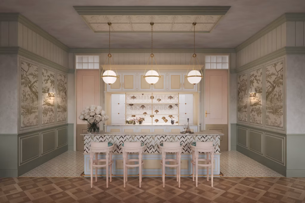 The project involved transforming a 1980s concrete building facing a quiet courtyard into a retro-style European boutique. The exterior was redesigned with an inset entrance and display windows, while the interior drew inspiration from 19th-century Victorian architecture, complemented by late 18th-century Neoclassical and Rococo aesthetics.