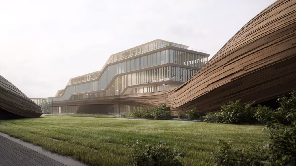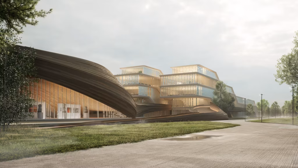 Our design integrates modular laboratory spaces, rooftop greening, and a three-dimensional mobility system for both pedestrians and cyclists, aligning with the dual-carbon strategy. Addressing the challenges of the existing site—such as its single function, vast scale, and disorganized flow—we reimagined the circulation and landscape to create seamless connections between buildings. The design incorporates streamlined pathways and green bridges, offering a unified and dynamic experience across the park. With minimalist geometric forms and sculptural elements, the overall design reflects the park’s focus on innovation, technology, and vitality.
